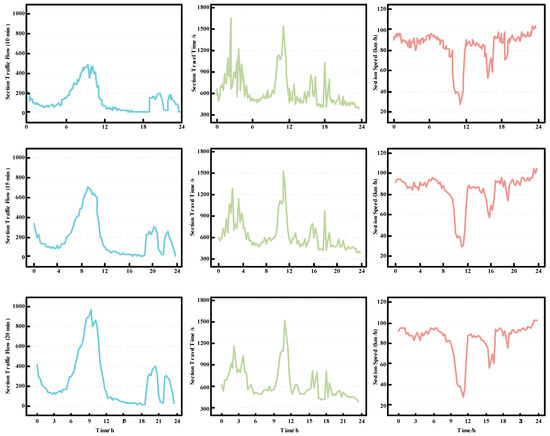 in which is the transaction time at the front gantry of the section or the starting node of the road, and is the transaction time at the rear gantry of the section or the end node of the road. If vehicles pass through this section/road during the th time period, the travel time of these vehicles can be represented as: