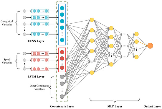 It can be seen that utilizing the EENN to handle discrete variables enhanced the performance of the model, with the MAE and RMSE values improving by 7.60% and 4.68%, respectively, whereas using one-hot encoding to handle discrete variables conversely increased the errors in time restoration. This might be because one-hot encoding, while increasing the dimensionality of the dataset, does not offer much useful information about the discrete variables, easily leading to a very sparse feature matrix that is not conducive to model training and generalization. By using LSTM to extract the vehicle speed variation features over several continuous sections, we likewise improved the effect of time restoration, increasing the MAE and RMSE values by 9% and 7.29%, respectively. From the foregoing analysis, it can be inferred that for regression problems in structured data, it is essential to use appropriate methods or models to deal with different types of feature inputs to enhance the performance of the model and better address practical issues.