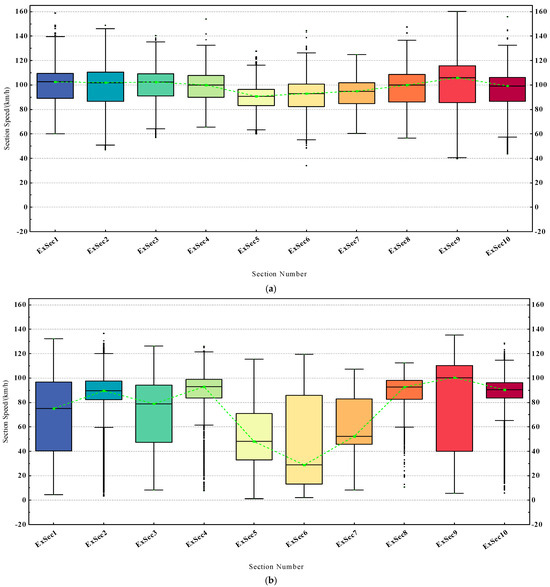 The vehicle section speed distribution box plot for 10 different sections in 24 h of a day, where (a) represents the non-holiday dataset, namely June 1st, and (b) represents the holiday dataset, namely May 1st.