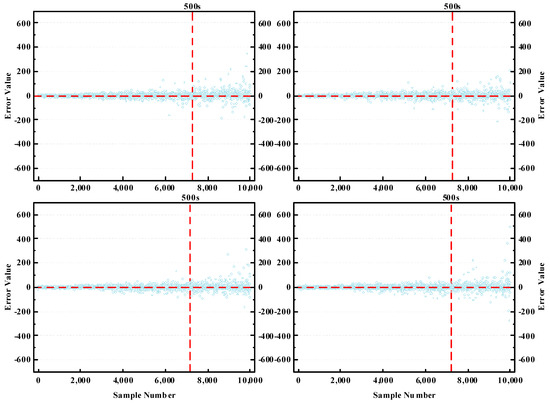 To more clearly demonstrate the restoration effect of the model, we constructed scatter plots showing the error degree between the estimated and actual values. Given the vast size of the test dataset, we carried out four random samplings of the test data, taking 10,000 data points each time, as shown in Figure 11.
