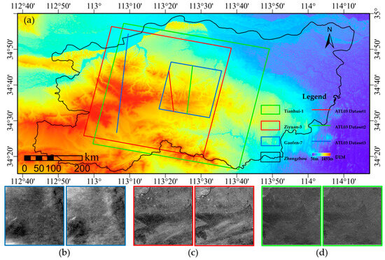 Zhengzhou in central China was selected as the study area (112.50–113.50° E, 34.15–34.60° N). The terrain in this area varies considerably, with mountains, hills, plains, and an appropriate amount of vegetation and buildings distributed around the study area. The surface slopes differ appreciably, meaning that the performance of the algorithm can be fully verified. The method proposed in this study was verified and analyzed using optical stereo images from Gaofen-7, Ziyuan-3, and Tianhui-1, as well as data from the ATL03 [33] and ATL08 [34] products in the ICESat-2/ATLAS laser altimeter system. Table 1 describes the main parameters of the images in the study area.