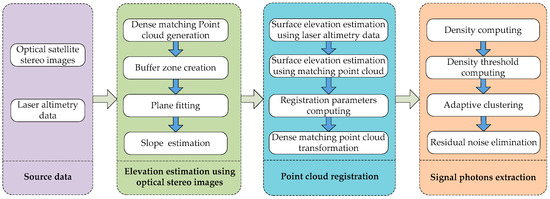 First, dense matching of the optical stereo images was performed to obtain point clouds with which to invert the surface slope and elevation at the location of the laser altimetry data. The dense matching point cloud was then matched with the laser altimetry data. Finally, the optimal terrain matching slope was selected from the terrain slope estimated using the dense matching point cloud as reference data for adaptive signal and noise identification. A flowchart of the overall proposed method is shown in Figure 2.