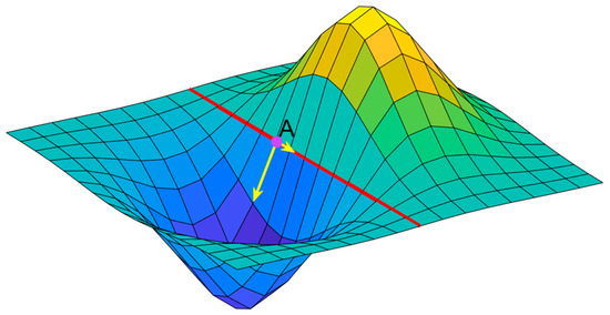 Schematic diagram of the difference between the terrain slope and the along-track terrain slope. The colored pixels of the terrain correspond to different elevations. The red line represents the ground track of the ATL03 data, and the size and direction of the two yellow arrows correspond to the slope gradient and direction of the terrain and the along-track terrain, respectively. Point A is an example of where the slope can be both steep and shallow depending on the track direction.