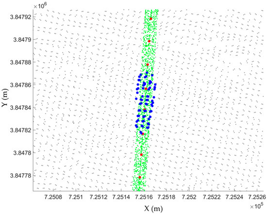 Dense matching point clouds within buffer zones. The green, gray, blue and red points denote the ATL03 data, the dense matching point clouds, the dense matching point clouds in a buffer zone, and the center points of the fitting centerlines of the ATL03 segments, respectively.