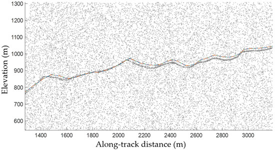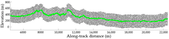 In this situation, some high-density noise may be retained as signal points. Hence, more noise must be removed. In this study, the residual noise was eliminated based on the absolute elevation difference and the 3 confidence level. First, the extracted signal photons were separated into segments of a fixed length, and points with elevations higher or lower than the values obtained from dense matching point clouds were discarded. The average values and standard deviations of the elevations associated with the remaining photons in each segment were then calculated. If the elevation of a point differed from the average elevation by more than 3, the point was considered noise and was removed from the results.