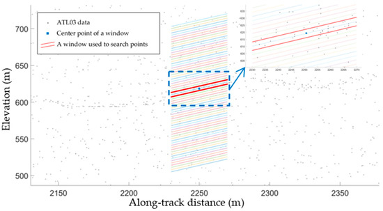 Theoretically, when the density of the potential laser altimetry point cloud is estimated along the terrain slope, the highest density is obtained. Therefore, neighborhood search along the terrain slope is critical for accurate estimation of the highest point cloud density in each segment. Nevertheless, spatial distribution differences were observed between the segment-wise derived slopes and elevations in Section 2.2.1 and the actual terrain. Hence, the along-track slope values of the laser altimetry data had to be carefully selected in order to calculate the maximum point cloud density in each segment. First, a segment was divided into sub-segments. The window length was identical to that of the segment, while the window width had to be selected carefully. A small window can result in a large number of calculations, meaning that the relationships between the terrain features may be lost and the calculation results rendered inaccurate. On the contrary, significant noise can be included when a large window is used, meaning that the calculated densities will be lower. In short, an appropriate window width, usually around 2–3 m, needs to be chosen. Important factors to be considered are the elevation accuracy of the laser altimetry data, the land cover type, and the position and accuracy of the derived slopes based on the dense matching point clouds. In addition, to ensure the accuracy of the density estimation, some parts of the sub-segments should overlap. In other words, the step size should be smaller than the window width, and the angle of rotation of the window should be as consistent as possible with the actual slope. A segment was divided into sub-segments according to the dense matching point cloud-fitting slope and elevation. The angle of rotation for the window followed the calculated slope of the segment of interest and the estimated slopes of several segments adjacent to the segment of interest. The maximum densities of all the sub-segments were then calculated. The terrain slope corresponding to the highest point cloud density was likely closest to the actual terrain slope, and this elevation was thus taken as the terrain elevation for the segment. This process was repeated until the terrain elevations for all segments were calculated. Figure 6 shows that the angle of rotation followed the best-fitting slope based on the dense matching point cloud of the segment. The highest average density of the laser altimetry point cloud lies between the two red solid lines. The center point (blue point) in the window bounded by the two lines denotes the terrain elevation of the segment based on the ATL03 data.