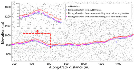 Point registration based on terrain similarity. Gray dots represent the ATL03 data, while blue diamonds denote the surface elevations obtained from the laser altimetry data. The orange squares are the along-track terrain elevations based on the dense matching point clouds and the purple stars represent their matched counterparts. The top left corner shows the enlarged registration result in the dashed red rectangle.