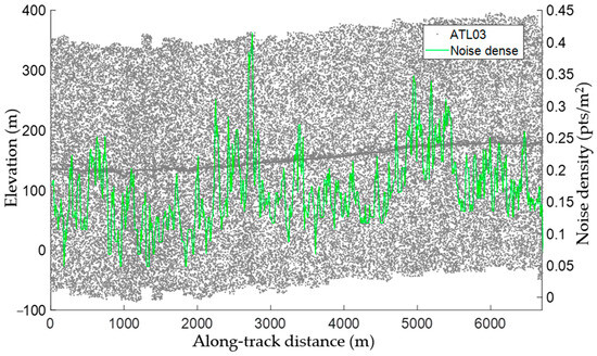 The density threshold is that at which the noise and signal points are classified. The value of this threshold is related to the densities of the noise and signal points and the range of the search neighborhood and can be set according to the estimated noise and signal point densities and the size of the previously determined neighborhood. The density threshold should lie between the noise and signal density for a potential signal region, and to better preserve the ground surface signal points, the density threshold should be closer to the maximum noise density. Furthermore, due to differences in factors such as surface reflectance, atmospheric environment, altitude, and sun incidence angle, the noise density varies significantly along the track direction [39] and the signal point density is uneven. The fluctuations observed in the noise density distribution (Figure 8) suggest that the along-track distribution of the noise was uneven, with considerable spatial differences. The noise density corresponding to the curve was calculated using noise photons; the surface elevations obtained from the matched dense matching point clouds were taken as references and points with higher or lower values were considered noise. The noise density was then calculated segment-wise. It was apparent that the density threshold associated with along-track signal photon extraction was not global and that a local density threshold was required for each segment.