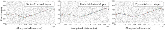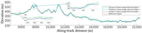 Figure 12 shows the slopes and elevations derived from the dense matching point cloud data using the three types of optical stereo images. For better illustration, the results derived at 17–18 km from dataset 2 were selected. After registration, the derived slopes and elevations from the three types of stereo images differed slightly in location with vegetation, buildings, or significant terrain variations. However, the results were generally consistent with the actual terrain and accurately reflected the changes. According to the aforementioned analysis, the derived and actual slopes may vary considerably when the elevations change abruptly in locations including features such as buildings, vegetation, and steep terrain. However, optimal selection based on segments adjacent to the segment of interest allows correct reflection of the terrain slope in a segment.