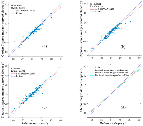Slopes obtained from different types of optical stereo images and reference laser altimetry data. (a–c) Scatter plots of the obtained slope results, and the coefficients of determination and fitting lines of Gaofen-7, Ziyuan-3, and Tianhui-1 stereo image-derived slopes with the reference slopes, respectively. (d) Overlay of the three fitting lines.