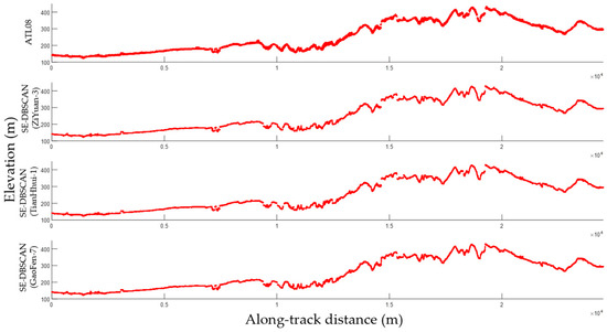 The performance of the proposed and ATL08 algorithms was quantitatively analyzed using recall, precision, the F1-score (Table 3). The results demonstrated that the extracted ground surface signal photons were relatively accurate when assisted by slopes and elevations derived from the Gaofen-7, Tianhui-1, and Ziyuan-3 stereo images. The precision of the extraction results based on the three types of images was 94.58%, 94.67%, and 94.86%, respectively. The average precision of 94.70% was higher than that of the ATL08 algorithm (84.41%). However, the ATL08 algorithm achieved a higher recall (96.96%). This is mainly because, in order to extract more vegetation points, the ATL08 algorithm classifies points that are close to the ground surface as signal points; thus, more noise points are included, and precision is reduced. According to the F1-score, the proposed algorithm slightly outperformed the ATL08 algorithm when the three types of images were used.