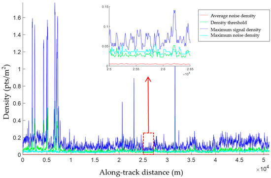 The noise density, maximum noise density, maximum signal density, and density threshold of each segment in dataset 3 are illustrated in Figure 14, together with an enlarged view of some of the results. The noise density and the maximum noise and signal densities varied significantly along the track direction. The segment-wise density threshold extracted using the proposed algorithm, which varied in the same manner, lay between the maximum signal density and the maximum noise, allowing the maximum number of noise photons to be removed. Overall, significant signal density variations were observed along the track direction, and the average and maximum noise densities were also considerable. However, the density threshold could be adjusted according to the noise level in each segment using the proposed algorithm.
