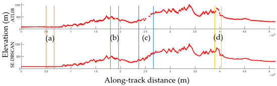 Figure 15 shows the final signal photon extraction results obtained using the ATL08 and proposed algorithms. The proposed algorithm was able to extract more continuous signal photons, while the ATL08 algorithm resulted in minor discontinuity at some localities (intervals bounded by vertical lines of the same color in Figure 15). Some signal photons were lost at these localities, which were situated in a steep or undulating terrain. The steep slope in these areas meant that the SNR was low, rendering signal photon extraction difficult. Continuous signals could be obtained using the proposed algorithm because the elevations and slopes derived from optical stereo images were adopted.