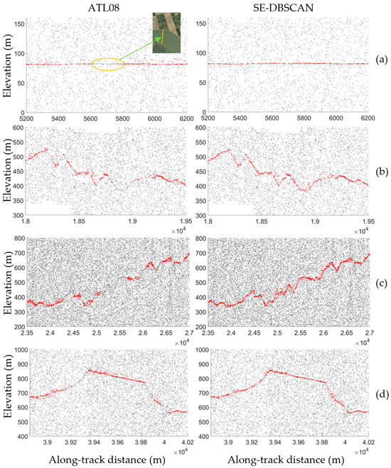 Comparison of the signal extraction results for typical areas. A flat terrain (a), an undulating terrain (b,c), and a steep slope (d) are shown. Gray dots represent the ATL03 data, while red dots represent the extraction results extracted by the ATL08 algorithm and the proposed algorithm. Yellow line in the image represents the location of surface signal points in the yellow elliptic, which were not extracted by the ATL08 algorithm.