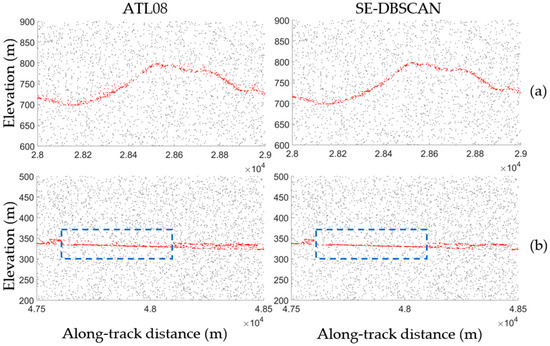 Comparison of the extraction results for typical ground features. Land cover with low vegetation (a) and buildings (b) are shown. Gray dots represent the ATL03 data, while red dots represent the extraction results extracted by the ATL08 algorithm and the proposed algorithm. The dashed blue rectangle shows an area adjacent to a building.