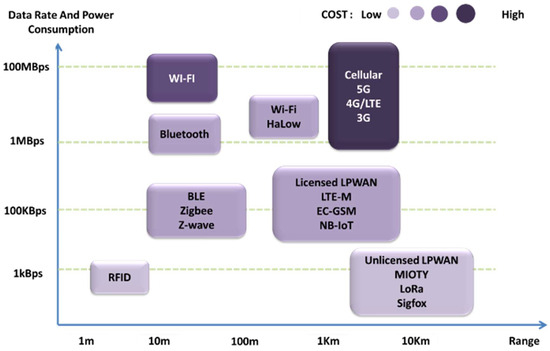 The rapid development of the Internet of Things (IoT) enables ubiquitous connectivity among various machines through wireless communication, significantly impacting people’s daily life in many domains, such as smart cities, smart homes, garbage monitoring, smart parking, smart transportation, etc. The surrounding information is sensed by IoT devices and shared with people for efficient services and among themselves. In smart parking, short-term wireless networks are used. Multiple techniques such as Bluetooth, ZigBee, Wi-Fi, long-term evolution (LTE), etc. achieve efficient communication [3]. These methods can provide reliable communications and high-speed data transmissions between IoT devices. The Low Power Wide Area (LPWA) networks, which employ a novel wireless protocol, are also very famous in the field of transmission in the current era due to their long-range communication at low power. They offer high energy efficiency, low power consumption, and high coverage capabilities. Figure 1 compares LPWA networks and many other connectivity technologies regarding power consumption, bandwidth, cost, and range.