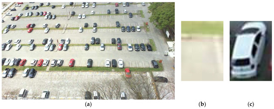 This dataset is segmented into two classes: empty parking space class and the occupied space class. The total number of images after segmentation is 695,899, of which 337,780 (48.54%) comprise empty parking space images and 358,119 (51.46%) comprise occupied space images. Figure 4b (empty sub image) and 4c (occupied sub image) show the segmented parking spaces.