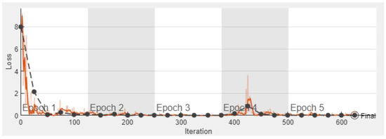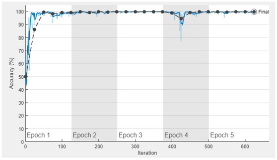 Each convolutional layer visualizes the object features in the images, such as texture, angle, and the edge of the target images. Figure 5 shows the training graph using a customized AlexNet pre-trained network. This graph shows the accuracy of the training and validation dataset using five epochs with a 0.0001 learning rate. There are 625 total iterations and 125 iterations per epoch. Figure 6 shows the graph of the training process of the loss and validation of the dataset using five epochs with a 0.0001 learning rate. The number of iterations and losses are shown along the x-axis and y-axis, respectively.