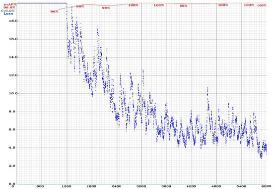 The YOLO training process is shown in Figure 7. Furthermore, during the training process, each image will be resized by a width of 416, and height of 426 is also required in the configuration file, which may be changed as needed. The 6000 iterations (max_batches) are identified to predict two classes (empty parking slots and occupied parking slots), and steps of 4800 and 5400 iterations (as per the policy) equal to 80% and 90% of the max_batches. The training configuration file uses a network size width = 416 and a height = 416, which means that every image will be resized to the network’s size during training and detection.