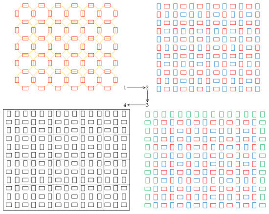 Step 2: Remaining spaces are filled with additional omnidirectional wheels to accommodate cargo boxes of diverse dimensions. These wheels are arranged systematically to ensure that, at any given point, at least one wheel is oriented orthogonally in relation to others. This arrangement not only preserves conveyance flexibility but also facilitates cargo adjustment. This step culminates in the design completion for both cargo conveyance and adjustment areas.
