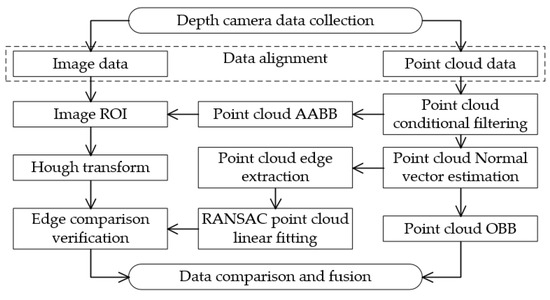 Cargo pose recognition is the detection and determination of the position and orientation of cargo items in scenarios such as automated logistics, robotics, and industrial production. This is achieved using sensors and algorithms. Common methods for this purpose encompass computer vision, deep learning, laser radar, ultra-wideband, marker-based capture, tactile sensors, and multi-sensor fusion. Notably, computer vision stands out due to its non-contact scanning, flexible deployment, rich information extraction, real-time capabilities, and independence on external devices. The fusion of computer vision and deep learning has a wide range of applications. For instance, Hinterstoisser et al. sampled and extracted robust models for object registration, which were then subjected to model matching and ICP refinement [8,9]. Drost et al. implemented a “global modeling, local matching” strategy through descriptors, formed by a small number of point pairings on point clouds [10,11]. Spatial pose resolution can be achieved through a three-point correspondence, leading to the emergence of even more precise and robust descriptor methods [12]. Regression methods utilizing random forests establish a map linking images to model coordinates [13]. Additionally, end-to-end registration is based on neural networks [14], as well as iterative registration using probabilistic models. Although highly accurate in complex environments, these methods require substantial data and computing resources, which can limit real-time applications and decrease flexibility. Dilotis et al. recognized and located boxed cargo by segmenting planes on point clouds [15]. Building upon a successful 2D perspective image-based single-regression framework, Ali et al. extend it to generate oriented 3D object bounding boxes derived from point clouds [16]. Due to the limitations of square boxes, such as impractical spatial usage and unstable stacking, rectangular boxes are prevalent. This led to the emergence of rectangular detection algorithms based on geometric features. Two primary approaches include the Hough transform-based rectangular detection algorithm and the rectangular geometric feature-based detection algorithm [17]. Harris et al. introduce a corner feature-based rectangular detection algorithm [18], while Feng et al. propose an improved minimum bounding rectangle algorithm utilizing only point clouds [19].
