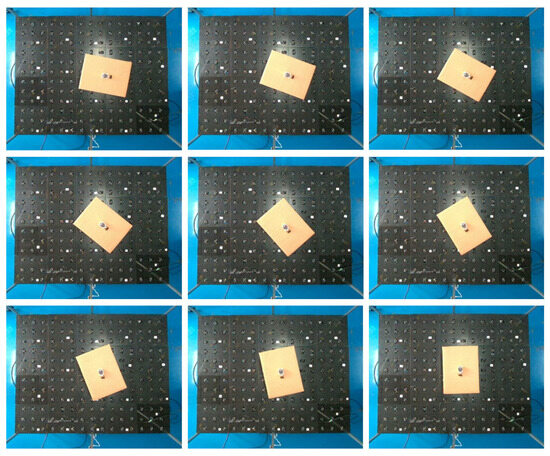 The experimental platform utilizes omnidirectional wheels with a diameter of 58 mm and a set of fixed omnidirectional wheels arranged in concentric circles with a radius R of 0.1 m. The cargo box adjustment experiment was conducted based on a foundation where the line speed v0 of the omnidirectional wheels was set at 120 revolutions per minute. The adjustment was completed within 4–5 s, aligning with the rotational adjustment motion analysis outlined in Equation (4). To mitigate the effects of inertia, we set a stop criterion: the adjustment operation ceased when the identified angular deviation from the expected result was <1°. In other words, the adjustment operation was halted after recognizing an angle of 0.962°, and the final angle at the point of cessation was 0.138°, with minimal deviation from the expected value of 0°, indicating a high level of precision.