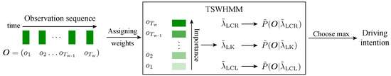 The process of driving intention recognition through TSWHMM is shown in Figure 3. The input observation sequence is first determined based on the size of the time window , where represents the current momentary observation data. After receiving the observation sequence, TSWHMM assigns weight coefficients in temporal order, emphasizing data closer to the current moment as more important. The trained behavioral models, namely , , and , then compute the observation sequence probability with temporal weights, denoted as , respectively. Finally, the driving intention of the model with the highest probability is recognized as the current moment’s result. If there are two or more models with the highest probability, the result from the previous moment is chosen as the current moment’s result. This process is repeated for each subsequent moment until completion.