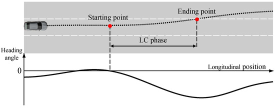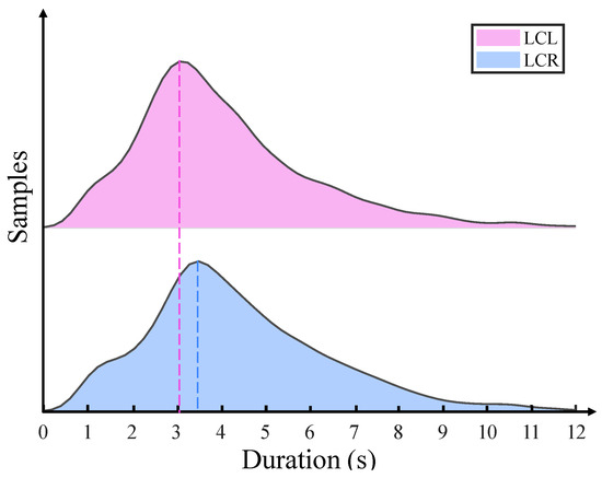 The subsequent section details the methodology for extracting LC phase data from the HighD dataset. The LC phase lacks definite starting and ending points for lane changes, and manual labeling is usually required. Given the vast amount of data, manual labeling is inefficient, underscoring the need for a clear definition of the lane changing process. We define the LC phase as follows: The moment the last heading angle reaches zero before the vehicle crosses the lane line marks the LC start. The point where the vehicle’s center crosses the lane line denotes the LC end. The duration between these points is the LC phase (Figure 5). Extracting data for the LK phase is easier. It is only necessary to ensure that the sample size is similar to that of the LC phase. Table 3 shows the number of LC phase samples extracted from HighD based on the above definition. Figure 6 provides a statistical representation of the duration distribution for the two LC phases. Overall, the duration of both is around 3 s, with the LCL phase being shorter than the LCR phase. This may be because most LCL behaviors aim to overtake or switch to a faster lane. The samples are divided into training and test sets at a 4:1 ratio.