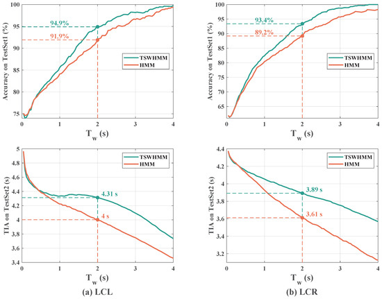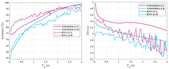Both models show similar trends as increases—accuracy rises while TIA decreases. Notably, compared to the RNN, the recognition accuracies of TSWHMM for the LCL and LCR intentions are closer together, indicating that TSWHMM achieves a better balance between these two categories. Moreover, as increases, TSWHMM’s TIA decline is more gradual than the RNN’s. This suggests that TSWHMM can achieve similar or better accuracy with a smaller TIA compromise than the RNN. Evaluations at s reveal, as presented in Table 7, that TSWHMM outperforms RNN across the board at this juncture.