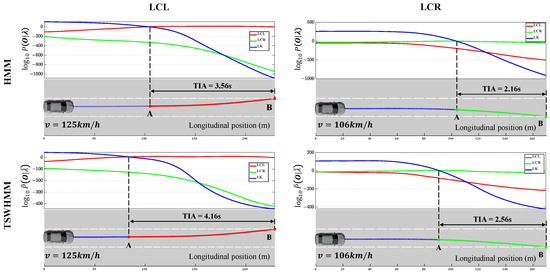 Combined vehicle trajectories offer a more intuitive demonstration of driving intention recognition. Figure 10 displays the intention recognition effect of both HMM and TSWHMM on a segment containing LK- and LC-phase driving trajectories. The coordinate domain represents the logarithmic value of or of each sub-model of behavior at each sampled point. For each sample point, the recognized intention corresponds to the model with the highest value of or . As can be seen, the curve of the coordinate domain for the TSWHMM is slightly “shifted” to the left compared to the HMM, resulting in an improvement in the TIA. This provides a clear visual representation of how the observation sequence weights are temporally adjusted by , effectively highlighting the superiority of TSWHMM over HMM.