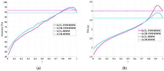 Influence of various values on the intention recognition model based on TSWHMM. When , the model reduces to HMM. (a) Accuracy variation in LCL and LCR with different values. (b) TIA variation in LCL and LCR with different values.