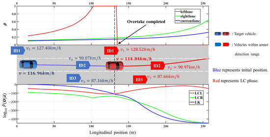 The effect of lane hazards on the intention recognition model. When vehicle ID1 in the left lane is about to overtake the target vehicle, the driving intention recognition model predicts that the target vehicle will make a lane change to the left.