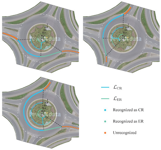 The process of recognizing driving intentions in roundabout scenarios using TSWHMM is consistent with that in highways. Upon receiving the observation sequence , we compute the corresponding based on the trained intention models and . The driving intention is then determined by the model with the higher likelihood value. To facilitate the demonstration of recognition effects in combination with trajectories, we normalize and in the following way: