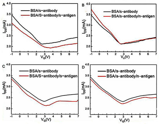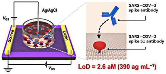 The coronavirus S protein is a large, multifunctional transmembrane fusion glycoprotein of the class I virus. The S protein is attached to the surface of the viral particle and determines the shape of the virus’ crown-like appearance. The coronavirus N protein promotes the assembly of viral particle and plays a role in the formation of the viral genome. After being infected with SARS-CoV-2, B lymphocytes or B cells produce five types of antibodies, IgA, IgG, IgM, IgD, and IgE, known as immunoglobulins [10]. Therefore, many researchers have detected SARS-CoV-2 by targeting antibodies. An ultra-sensitive GFET biosensor was prepared by Wei’s group [51]. The SARS-CoV-2 spike S1 protein was modified on the surface of the sensor to detect the spike S1 antibody (Figure 3). The SARS-CoV-2 spike S1 protein was immobilized on the surface of the graphene channel to realize biological functionalization. The strong specific binding between antibodies and proteins affected the concentration of the graphene channel medium and obtained a measurable electrical response. In this study, the GFET biosensor detection limit for the SARS-CoV-2 spike S1 antibody was as low as 2.6 × 10−18 M, and it took only 2 min to produce a diagnostic result.