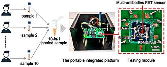Wei’s group [61] developed an electro-enrichable liquid gate FET functionalized with tetrahedral DNA nanostructures (TDNs) for direct detection of the SARS-CoV-2 nucleic acid. In November of the same year, the same group developed high-precision 10-in-1 multiantibody FET sensor pool testing, which could detect different configurations of the SARS-CoV-2 spike S1 protein [62]. The multiantibody FET sensor was able to capture three different spatial structures, which greatly improved the recognition efficiency for the spike protein as well as the sensitivity of the sensor. Due to its highly accurate characteristics, this group developed a portable integrated platform, realizing 10-in-1 antigen pool detection, reducing detection costs, and improving testing capabilities (Figure 11).