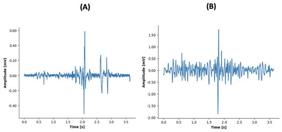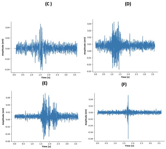 Representation of raw sEMG data of swallowing (A) 10 mL of water, (B) 25 mL of water, (C) saliva, (D) solid, (E) cough, and (F) talk.