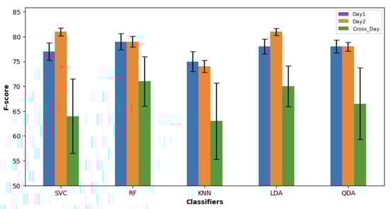 Classifiers performance with error bars depicting for the F-score and standard error over day 1, day 2, and cross-day.
