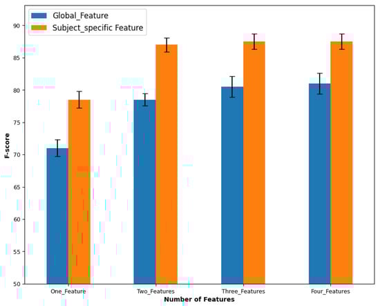 On the other hand, subject-specific features resulted in a global mean F-score for day 2 of . The best three classifiers were LDA (), QDA (), and RF (). In contrast to day 1, there was no difference between the number of features (p = 0.51). For example, four features gave , and three features gave . There was no interaction between factors. Table 2 depicts the best single-specific features with the best classifiers of day 1 (right side) which shows that the best feature combination is data-dependent and subject-dependent.