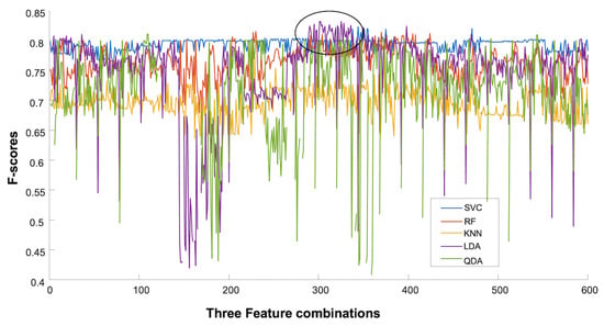 However, it can be seen from Figure 5 that their performance is feature-set-dependent, especially the LDA. On the other hand, the SVM showed robustness over changes in the feature set and could be explored more in future studies, allowing for the selection of features with low computation costs.