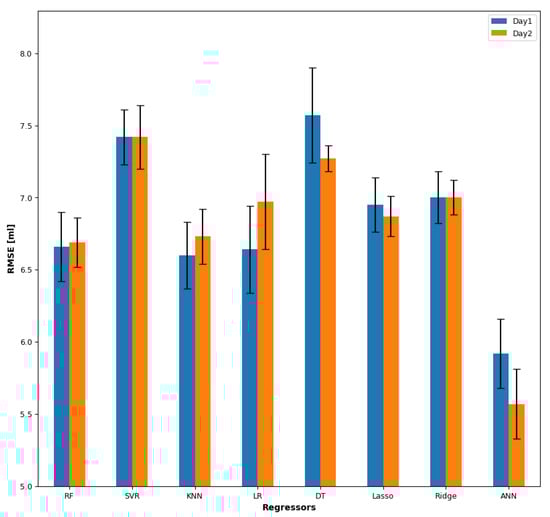 The regressors’ performances with error bars depicting the RMSE and standard error over day 1 and day 2.