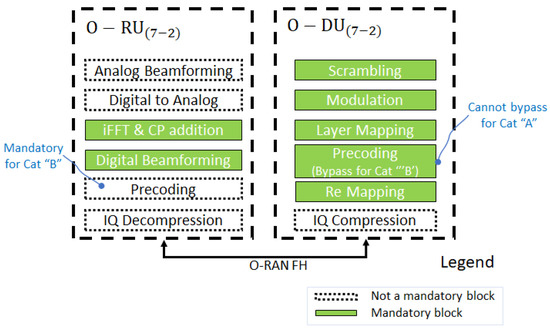 The O-DU/O-RU split point option showing requirements for Category A and Category B for the O-RU.