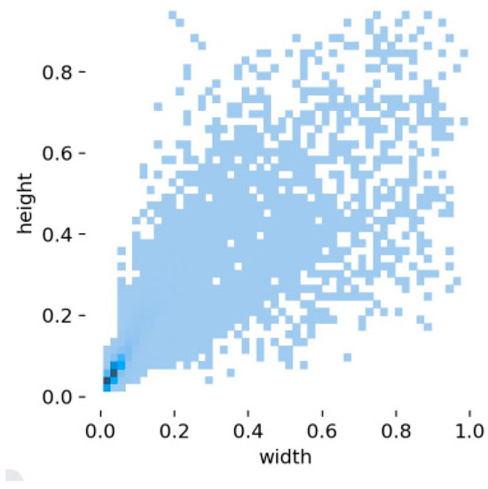 In the end, a total of 4000 original datasets were collected. Additionally, the original dataset was expanded to a total of 5000 images through data augmentation techniques such as image rotation, random image clipping, image scaling, adding Gaussian noise to images, and adjusting image brightness. The obtained dataset included 27,689 annotation boxes. Using an 8:2 ratio, the dataset was split into two parts: the training dataset and the validation dataset. Figure 1, which represents the statistical results of the size and distribution of the annotation boxes for each category, was generated by training the Yolov5 model using the dataset. According to Figure 1, in the lower-left corner, the target annotation boxes are most concentrated, and the targets in this area are small in size. In contrast, there are fewer target annotation boxes clustered in the upper right, lower right, and upper left corners, where the targets are larger in size. This indicates that there are more categories of small-sized objects in this dataset.