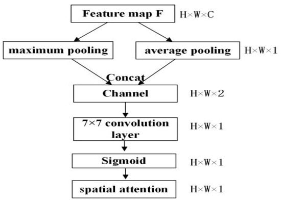 Figure 4 and Equation (2) represent the principle of the channel attention module. According to Figure 4, the input feature map of the channel attention module is H × W × C. Firstly, two 1 × 1 × C feature maps are obtained by processing the input feature map based on average pooling and maximum pooling. Secondly, the two obtained feature maps are subjected to the same convolution operation twice. The number of convolution kernels in the first convolution operation is C/r, and the activation function is ReLU. For the second convolution operation, the number of convolution kernels is C. Finally, the obtained feature maps are added together and the original input feature map is multiplied by a weight factor calculated by the sigmoid activation function to obtain the scaled feature map. Figure 5 and Equation (3) represent the principle of the spatial attention module. According to Figure 5, the input H × W × C feature map is initially processed by average pooling and maximum pooling to obtain the H × W × 1 feature maps. Secondly, they are concatenated, and then a 7 × 7 convolution layer is used to adjust the channel number. Finally, a weight factor calculated by the sigmoid activation function is used to multiply the original input feature map to obtain the scaled feature map.