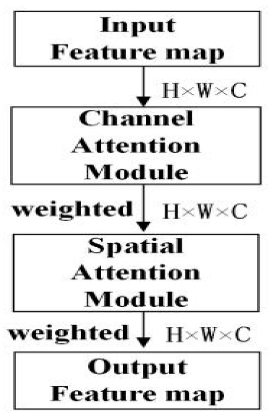When using the channel attention module to learn the importance of each channel, it first compresses the spatial features of the feature map, and then learns in the channel dimension to obtain the importance of each channel. The spatial attention module can transform various types of data in space and automatically capture important area features. It can ensure that images, after undergoing operations such as cropping, translation, or rotation, still produce the same results as the original image before the operation. The CBAM shown in Figure 6 combines the channel attention module and the spatial attention module together. It first processes the input feature map with a channel attention module; the results are then processed through a spatial attention module, and finally, adjusted features are obtained. The CBAM can learn key points of objects in training, improve the importance of the target in the complex background, and increase the accuracy of object detection.