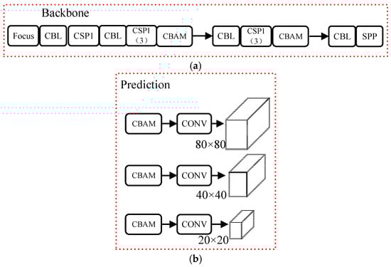 For convolutional neural networks, during the continuous convolution process, uniform convolution is applied to all features on the feature map, making it difficult to effectively highlight the key features of targets. In order to enhance the feature extraction capability for eight different types of targets within the region of interest while suppressing the influence of irrelevant information within the region of interest on the model’s feature weights, the CBAM is inserted into the middle and end sections of the DarkNet-53 network, as shown in Figure 7a. The CBAM is embedded into each CSP1 (3) module in the backbone network of YOLOv5s. With very few parameters, this enhances the feature extraction capability of the backbone network, thereby improving the initial feature extraction performance of the model. This allows the model to focus more on targets that may have been initially overlooked due to insufficient feature representation during the feature extraction process. As a result, it helps address the challenge of effectively extracting features from small and occluded targets within the region of interest.
