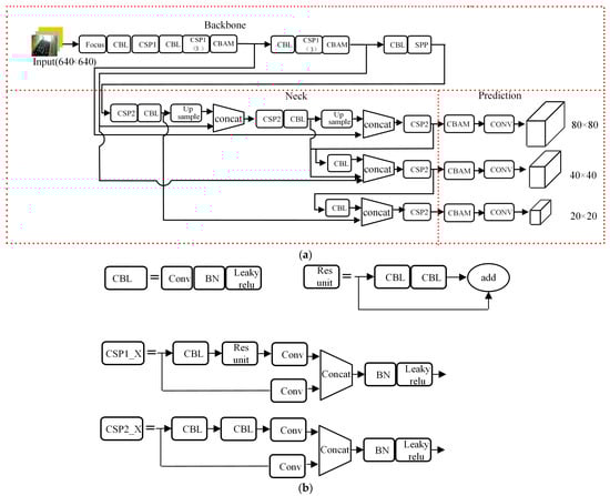 The structure of the proposed AMCFF-YOLOv5s model: (a) structure of AMCFF-YOLOv5s; (b) structure of CBL, Res unit, CSP1, and CSP2.
