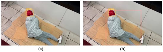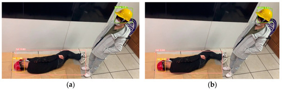 Simulation in the laboratory with a fallen person and a standing person in a red helmet and a yellow helmet, respectively: (a) detection results of YOLOv5s; (b) detection results of the proposed model.