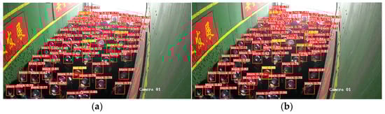 Multiple small objects in a coal mine hoist cage: (a) detection results of YOLOv5s; (b) detection results of the proposed model.