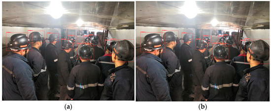 Figure 11, Figure 12, Figure 13, Figure 14 and Figure 15 show the visual results obtained by the proposed model and the YOLOv5s model, based on the test dataset. According to Figure 11, the fallen miner is marked with a pink box, and the red helmet is marked with an orange box. Using the YOLOv5s model, the red helmet is detected, but the fallen miner is missed. Meanwhile, for the proposed model, the two categories are both detected accurately. According to Figure 12, a standing miner is added into the image. The three categories, which are the fallen miner, the red helmet, and the yellow helmet, are all detected by the proposed model and the YOLOv5s model. However, the detection accuracy of the proposed model is higher. According to Figure 13, the helmets are small objects in the hoist cage, and the mutual occlusion phenomenon occurs. Therefore, some helmets are missed when using YOLOv5s. According to Figure 14, in the coal mine hoist cage, the close target is relatively large and the long-distance object is relatively small. All of the targets are detected using the two models, but the detection accuracy of the proposed model is higher. According to Figure 15, in a dim hoist cage with uneven light, the targets are small and fuzzy. All of the objects are detected; however, the detection accuracy of the proposed model is higher than that of YOLOv5s. From the above, the detection results of the proposed model are good, even though the conditions in the coal mine hoist cage are poor.