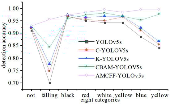 Figure 16 reflects the effect of the four improving measurements on the detection accuracy of each category. According to Figure 16, the four measurements have a positive effect on the detection accuracy. For the black helmet category, although the CIoU loss function and the CBAM reduce the detection accuracy, the calculated bounding box and the proposed BiFPN-based feature fusion network have a positive influence on the detection accuracy, which is improved by 0.6%.